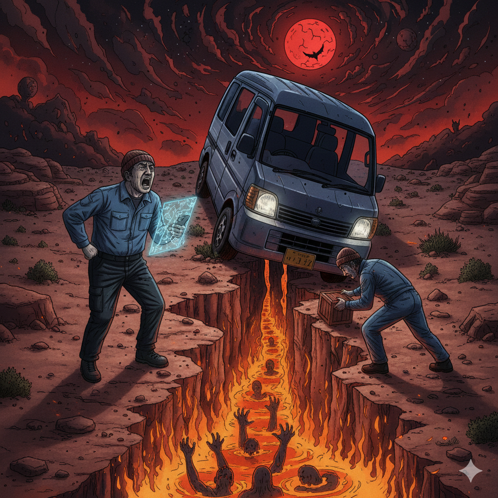 助けを待つ虚無の時間。配達は止まり、スケジュールは崩壊する。溝に嵌ったのはタイヤではない、己の慢心が生んだプライドの欠損だ。